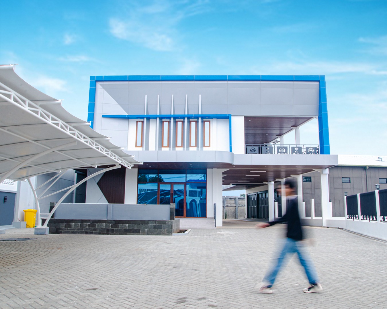 Elemen lengkung pada area teras kantor memberikan identitas visual yang kuat sekaligus menciptakan transisi ruang semi-outdoor yang nyaman. Area carport dengan struktur baja ringan bentang lebar dirancang untuk mendukung aktivitas kendaraan operasional. Keamanan juga menjadi perhatian utama. Area pintu gerbang dibuat kokoh dan tinggi, memberikan kontrol akses yang baik terhadap kendaraan keluar-masuk distribusi. Tampilan luar bangunan secara keseluruhan mencerminkan:
