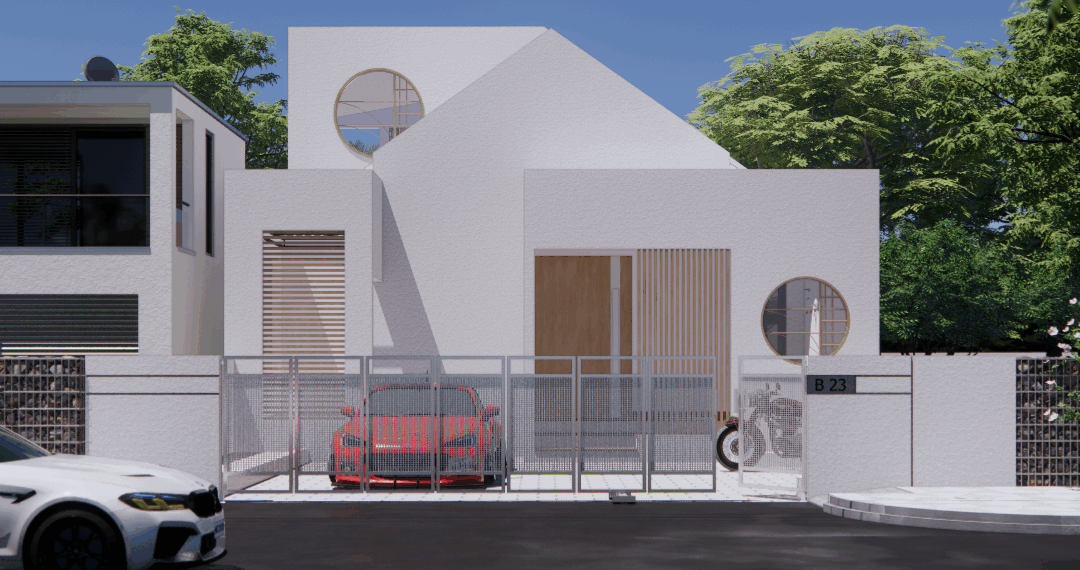 Desainnya memanfaatkan permainan volume asimetris—dengan atap miring sederhana dan bidang vertikal yang berlapis—untuk menciptakan siluet arsitektural yang khas. Elemen jendela bundar di dua sisi fasad menjadi focal point yang memecah kekakuan garis-garis tegas, memberi nuansa lembut dan artistik pada tampilan keseluruhan.