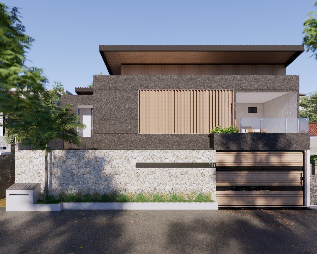 Rumah ini menampilkan gaya modern tropis dengan pendekatan natural dan kontemporer. Komposisi massa bangunan dibuat tegas dan geometris, menonjolkan garis horizontal yang kuat melalui penggunaan material dan permainan bidang.