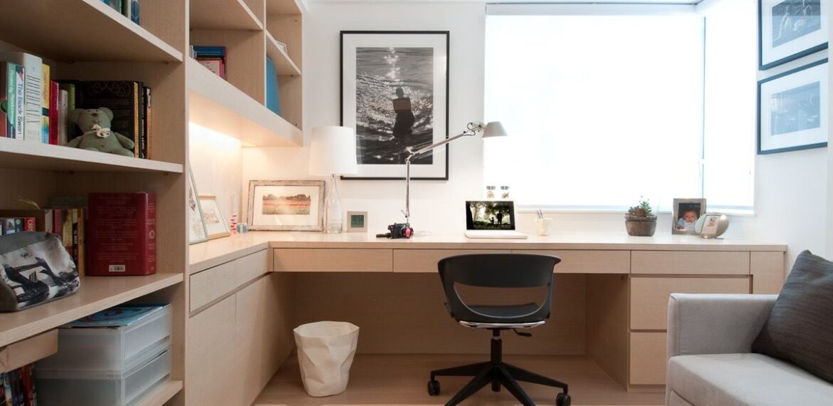 - Cahaya alami: posisikan meja kerja dekat jendela agar ruangan terasa segar dan terang.